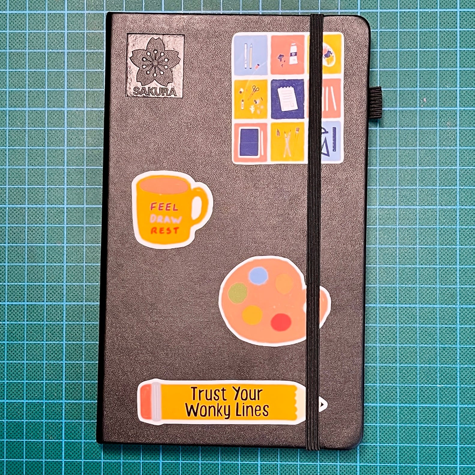 Puis j’ai préparé le nouveau sketchbook qui sera consacré à Mon Journal Dessiné, choisi un autocollant pour la couverture et j’ai décoré la page de garde, en attendant 22h pour la session BATWRITE #25 ou Beth Spencer était l’invitée de Alex Dobrenko`.